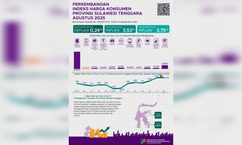 “Pada Agustus 2025, Provinsi Sulawesi Tenggara mengalami inflasi yoy sebesar 3,75 persen dengan Indeks Harga Konsumen (IHK) sebesar 110,32. Inflasi tertinggi tercatat di Kabupaten Konawe sebesar 4,97 persen dengan IHK 111,14, sedangkan inflasi terendah terjadi di Kota Kendari sebesar 2,89 persen dengan IHK 109,23,” jelasnya.