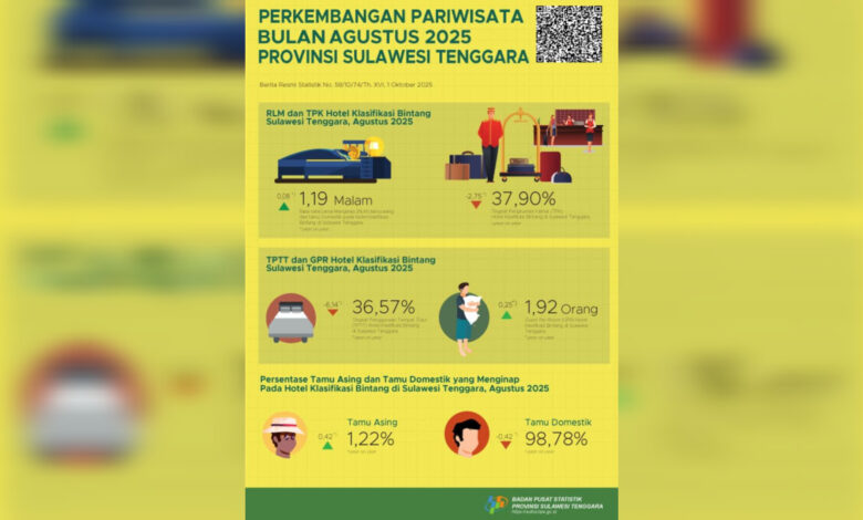 “Rata-rata lama menginap tamu hotel bintang di Sulawesi Tenggara pada Agustus 2025 tercatat selama 1,19 malam atau turun 0,01 poin dibandingkan dengan bulan sebelumnya,” ungkapnya.