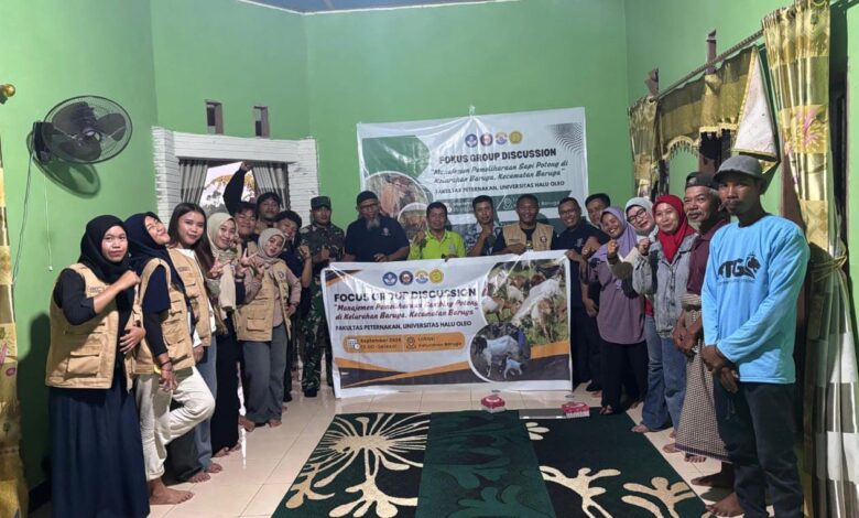 KENDARIKINI.COM – Forum diskusi manajemen ternak potong mahasiswa Kuliah Kerja Nyata (KKN) Fakultas Peternakan (FPt) Universitas Halu Oleo (UHO) gandeng dosen dan penyuluh edukasi peternak Kelurahan Baruga, Kota Kendari, Minggu 26 September 2025.