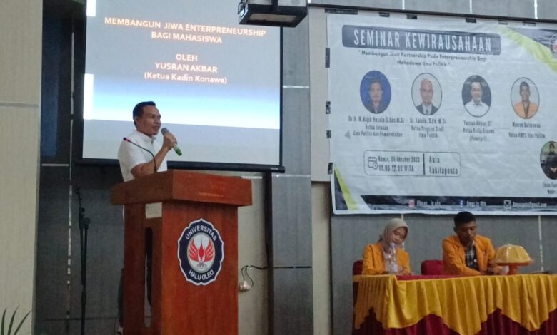 Kendari – Ketua Kadin Konawe, Yusran Akbar ST pacu semangat enterpreneurship pada seratusan Mahasiswa Fakultas Ilmu Sosial dan Ilmu Politik (Fisip) Universitas Haluoleo (UHO).