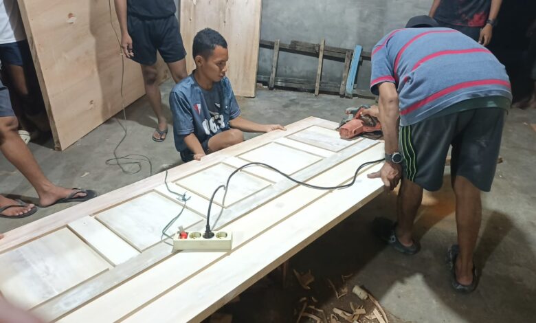 Pemasangan pintu dilakukan untuk menyempurnakan pembangunan rumah yang sedang dikerjakan.
