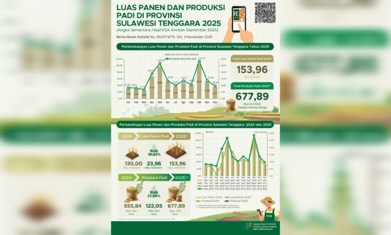 “Produksi padi dalam bentuk Gabah Kering Giling (GKG) pada 2025 diperkirakan sebanyak 677,89 ribu ton GKG, mengalami kenaikan sebanyak 122,05 ribu ton GKG atau 21,96 persen dibandingkan produksi padi GKG di 2024 yang sebanyak 555,84 ribu ton GKG,” ungkapnya.