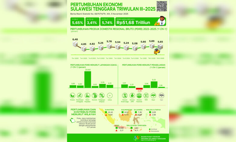 “Perekonomian Sulawesi Tenggara berdasarkan besaran Produk Domestik Regional Bruto (PDRB) atas dasar harga berlaku triwulan III-2025 mencapai Rp 51,68 triliun dan atas dasar harga konstan 2010 mencapai Rp 30,41 triliun,” katanya.