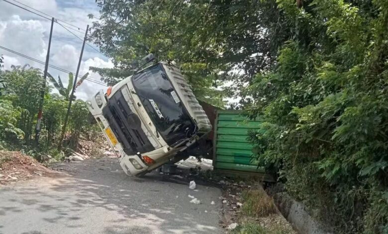 Akibatnya, saat pengemudi berusaha mundur, ban belakang truk masuk ke saluran drainase, hingga akhirnya kendaraan besar tersebut terbalik.