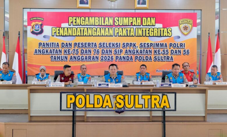 KENDARIKINI.COM – Polda Sulawesi Tenggara menggelar kegiatan Pengambilan Sumpah dan Penandatanganan Pakta Integritas bagi panitia serta peserta seleksi Sekolah Pengembangan Profesi Kepolisian (SPPK), Sespimma Polri Angkatan ke-75 dan 76, serta Sekolah Inspektur Polisi (SIP) Angkatan 55 dan 56 Tahun Anggaran 2026. Kegiatan ini berlangsung pada Jumat (21/9/2025) di Aula Dhacara dan Dhalas Polda Sultra.